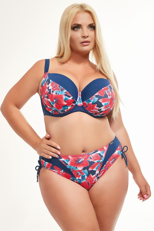 Uroczy model biustonosza kąpielowego z miękkimi miseczkami na fiszbinach zapewnia najwyższy komfort noszenia Paniom o większym biuście. Perfekcyjna konstrukcja doskonale utrzyma oraz ponętnie uniesie biust. Górna linia i tył wykonane z gładkiego granatowego materiału, dół miseczek natomiast cudownie ozdobiony kwiecistym wzorem. Ramiączka szerokie, regulowane gwarantują stabilność całej konstrukcji. Biustonosz zapinany z tyłu na tradycyjny, stabilny klips. Wykonanie z wysokogatunkowej tkaniny zapewni niesamowitą wygodę noszenia. Skład: 80% poliamid, 10% elastan, 5% bawełna, 5% poliester. |