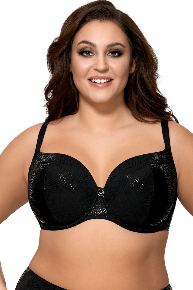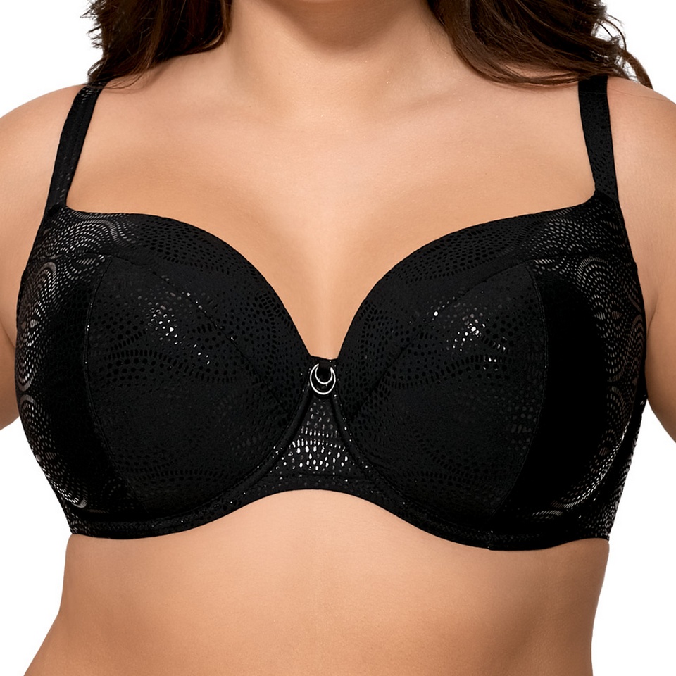 Czarny ustywniany biustonosz kąpielowy wyróżnia się spośród innych elegancją. Stanik kąpielowy wzmocniony został fiszbinami które doskonale podtrzymują biust i tworzą kuszący dekolt. Biustonosz zapinany z tył, ramiączka nieodpinane, regulowane.