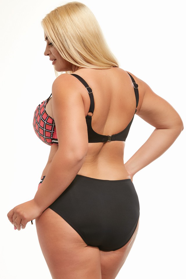 The perfect form of a soft Tanzania swim bra, it raises the breasts and characteristically collects the bust inside. Additional strengthening and comfort of wearing are guaranteed by side and bottom underwires as well as wide adjustable straps. The cups and bridge of the bra are made of patterned, colorful fabric, the back and straps of the bra are smooth and black. Straps width adjusted to the size, adjustable. The back is fastened with a traditional clip. Composition: 80% Polyamide, 10% Elastane, 10% Polyester. |
