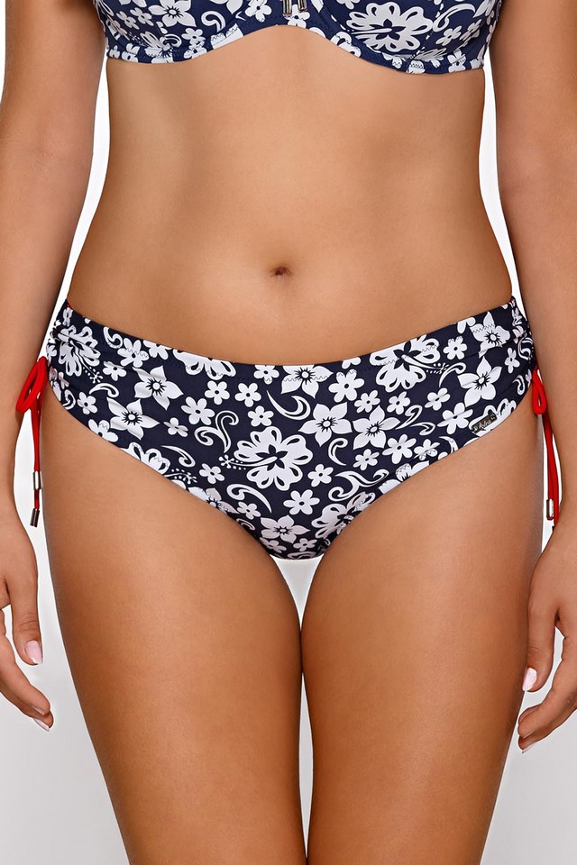 Figi w białe kwiaty na granatowym tle, ozdobione czerwonymi troczkami, którymi można regulować wysokość. Skład: 80% poliamid, 20% elastan. |